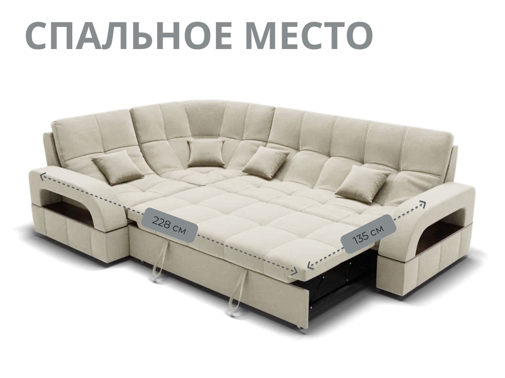 Спальное место имеет ширину 135 см и длину 211 см. Он предназначен для двух человек и имеет глубину сиденья 65 см. Максимальная нагрузка на диван составляет 280 кг.