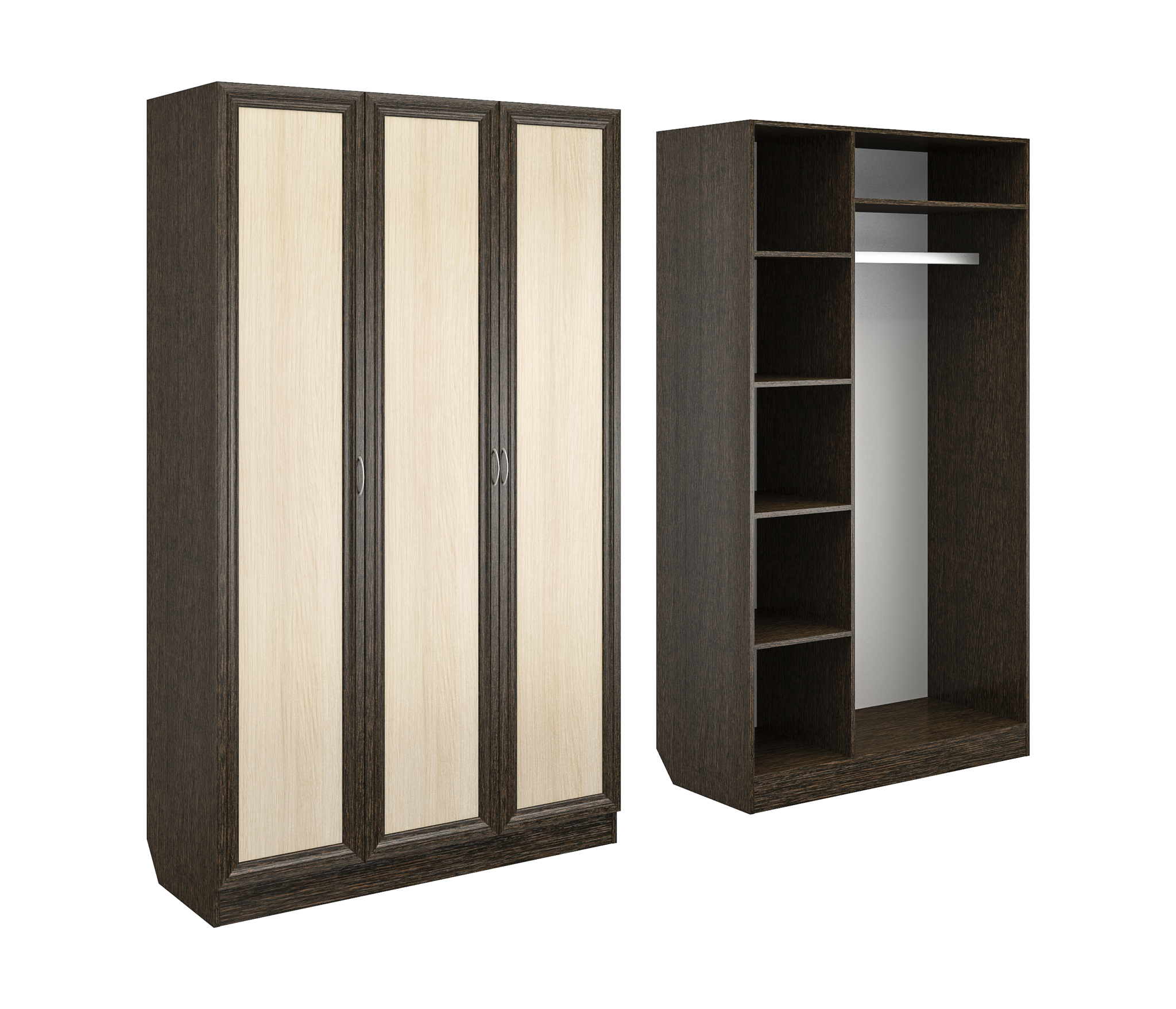 Корпус шкафа выполнен из Ламинированной ДСП высокого качества с насыщенным цветом. Фасады выполнены из материала МДФ.Ширина шкафа 120 см., большая и функциональная трёхстворчатая модель. В левой секции ниши для сложенных вещей. Справа штанга для одежды.