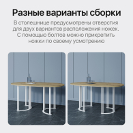 Подстолье, состоящее из двух ножек-полумесяцев, изготовлено из металла (высококачественная сталь) с устойчивой (двойной) порошковой окраской. Столешница выполнена из ЛДСП высокого качества Egger. Толщина столешницы - 25 мм.