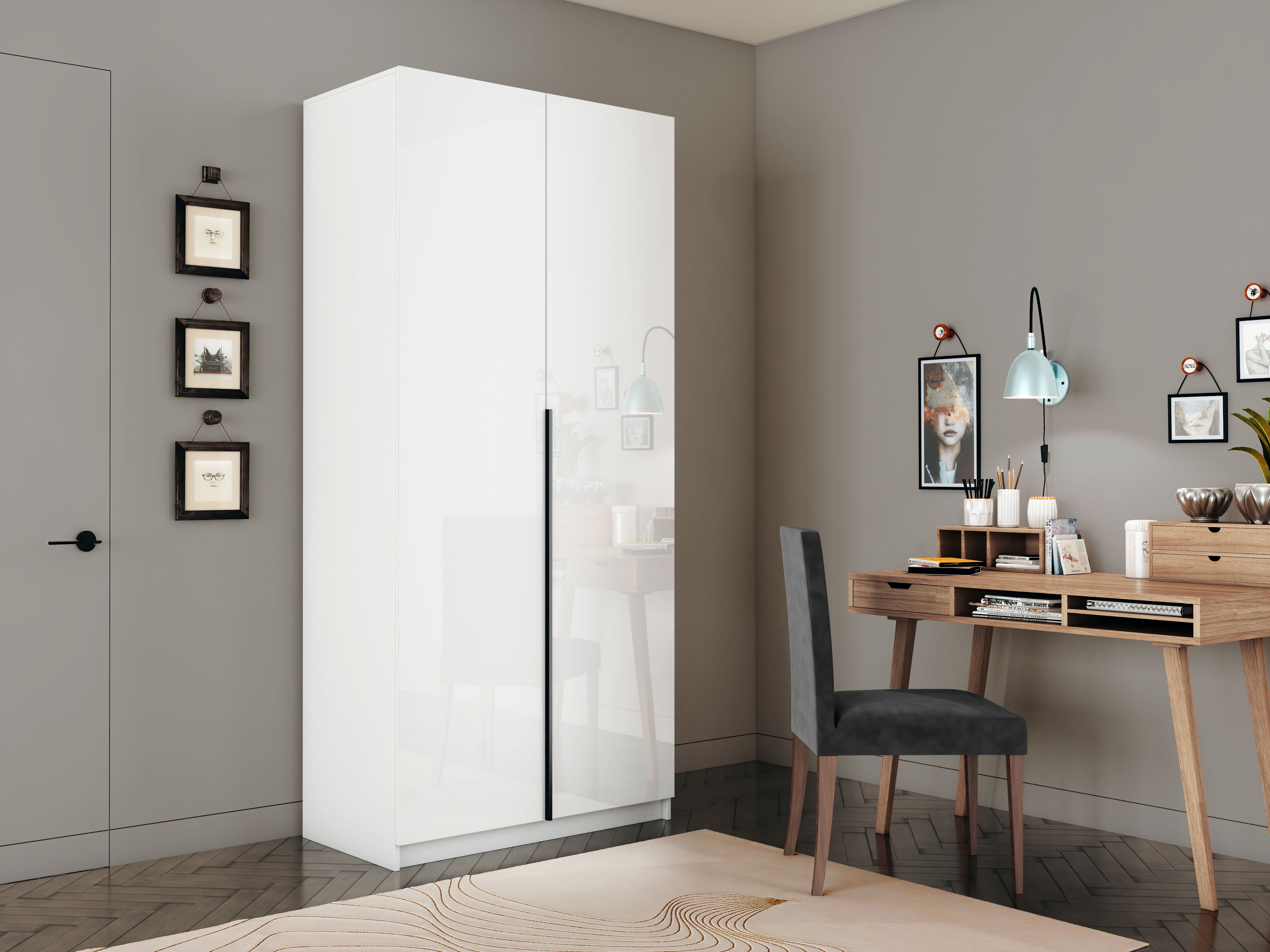 Шкаф оснащен удобной минималистичной ручкой, изготовленной из алюминия.