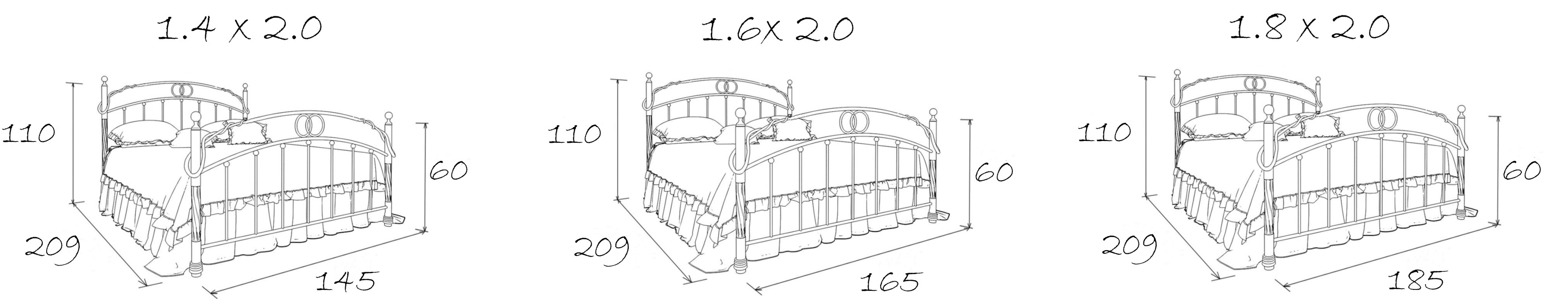 Размеры спального места (ДхШ) 2000х1600, высота изножья 600 мм, максимальная нагрузка на 1 спальное место - 150 кг.