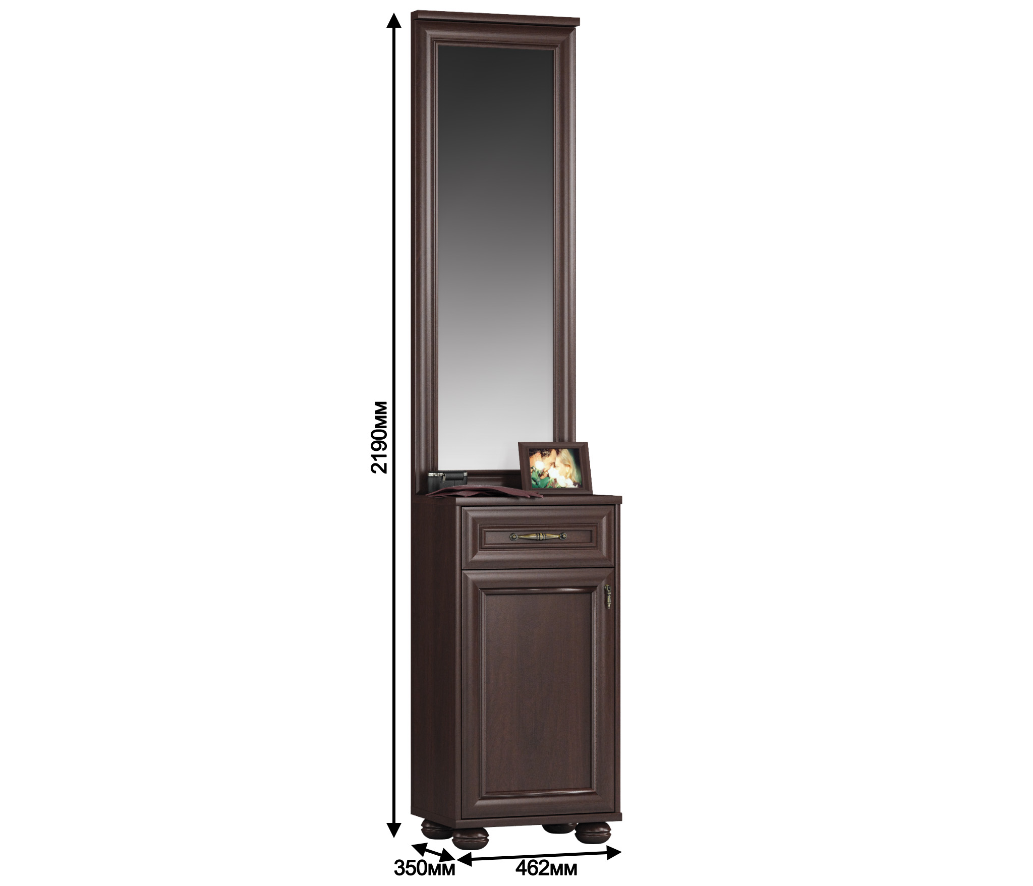 Габаритные размеры – ширина 46 см, высота 219 см и глубина 35 см. Нижняя часть – отделение с отдельной дверцей в котором можно хранить обувь и сумки. А в выдвижном ящике можно хранить разную мелочь. Тумба оснащена протекторами или «лапками», которые не позволяют повредить полы во время перестановки. Тумба выполнена в классическом дизайне из экологичного современного материала. Отделка в цвете «Мара Махагон».