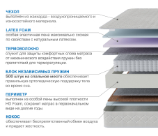 Данная модель сочетает в себе все компоненты, которые позволяют быть матрасу поистине комфортным и универсальным. Блок независимых пружин обеспечивает правильную поддержку позвоночнику и гарантирует расслабление мышц во время сна. Натуральный латекс, который используется в качестве комфортного слоя одной из сторон- считается премиальным наполнительным, который обладает уникальным сочетанием жесткости, упругости и долговечности. Вторая сторона матраса не много жестче, ведь там вместо латекса- латексированный кокосовый лист, который распределяет нагрузку по блоку пружин и придает матрасу необходимую жесткость. Чехол выполнен из плотного жаккарда, в составе, которого не менее 60% хлопка, а стегается он на 15 мм пене, что придает матрасу мягкость, при этом узор стежки подобран таким образом, что его поверхность обладает тем же эффектом микромассажа, что и ячеистые пены. Обращаем ваше внимание на то, что любой матрас отвечает за правильность положения во время сна нижнего и среднего отделов позвоночника, а за правильность положения шейного отдела отвечает правильно подобранная ортопедическая подушка. Рекомендуем использование с защитным чехлом AquaStop. |