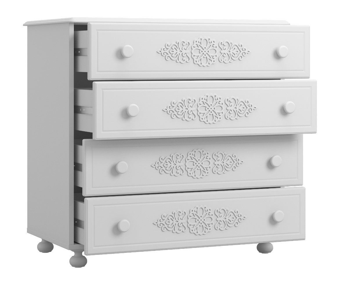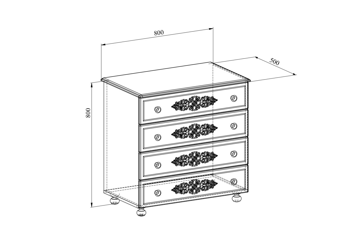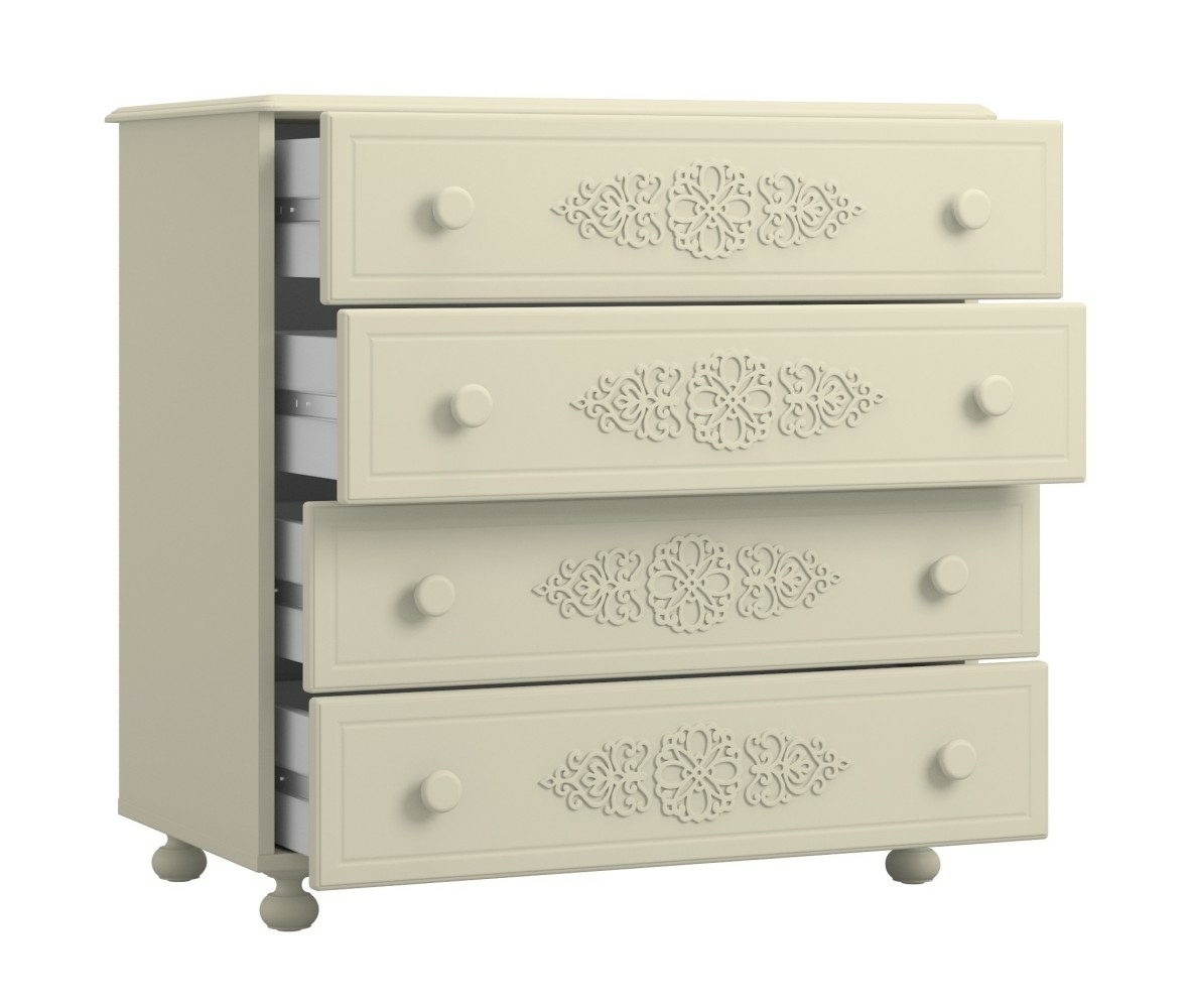 Комод имеет четыре выдвижных ящика.Высота боковых стенок каждого ящика 130 мм, ширина ящика 690 мм, глубина 400 мм. Ящики установлены на телескопических направляющих полного выдвижения.