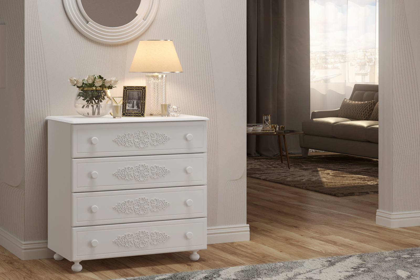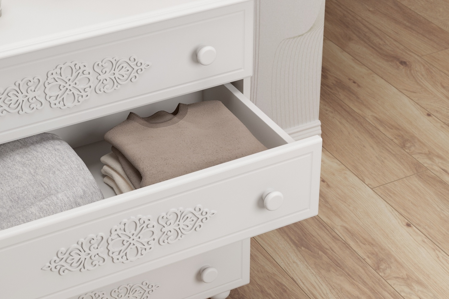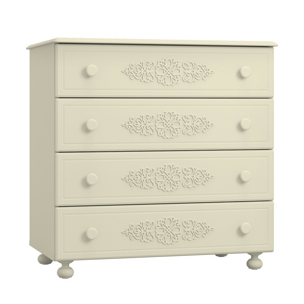 Комод имеет четыре выдвижных ящика.Высота боковых стенок каждого ящика 130 мм, ширина ящика 690 мм, глубина 400 мм. Ящики установлены на телескопических направляющих полного выдвижения.
