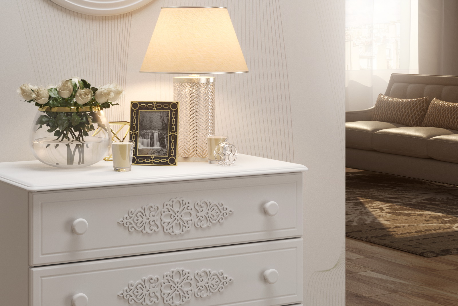 «Ассоль» - мягкий мерцающий глянец и эксклюзивный узор, повторяющийся на фасадах всех модулей идеален для создания нежного уютного интерьера спальни, гостиной, детской, прихожей.