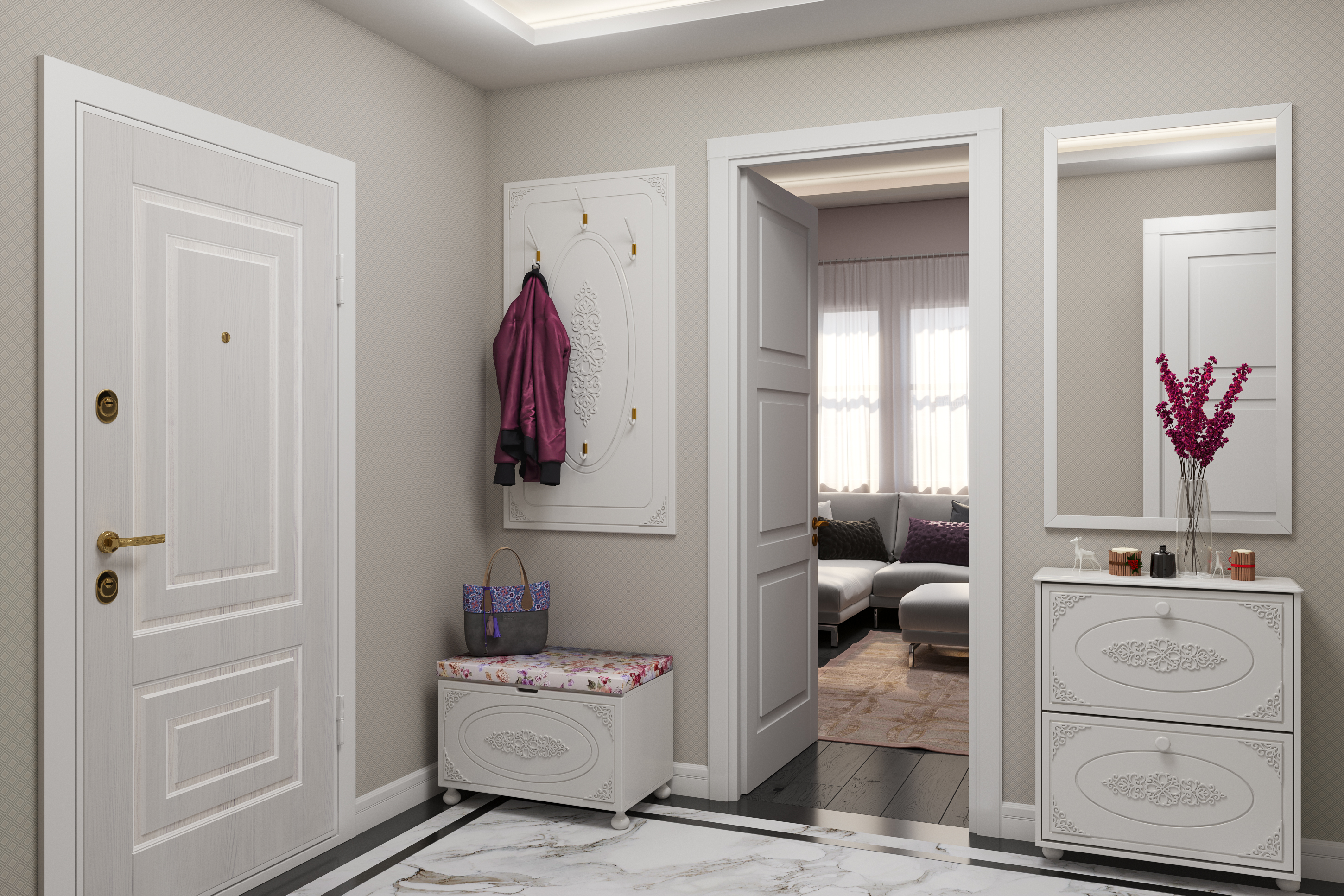 «Ассоль» - мягкий мерцающий глянец и эксклюзивный узор, повторяющийся на фасадах всех модулей идеален для создания нежного уютного интерьера спальни, гостиной, детской, прихожей.