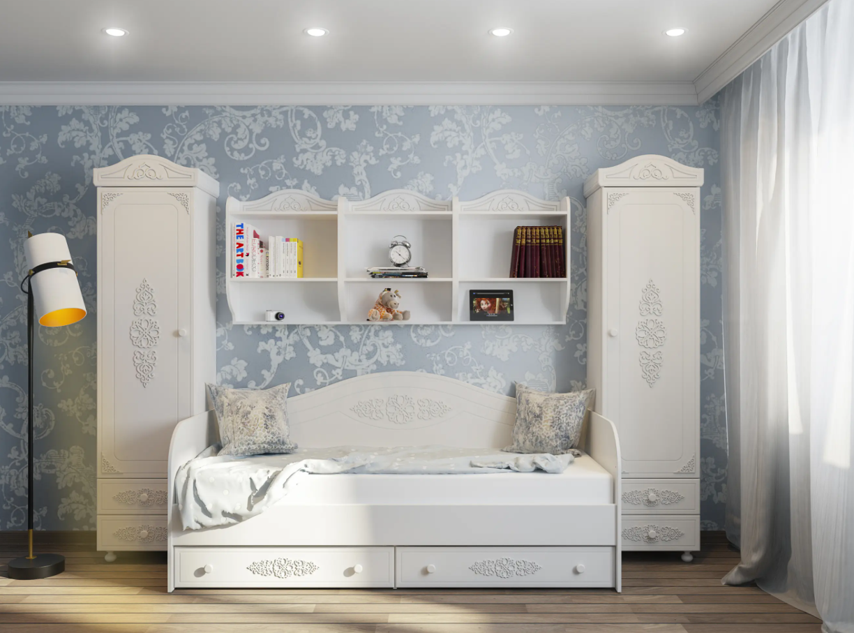 «Ассоль» - мягкий мерцающий глянец и эксклюзивный узор, повторяющийся на фасадах всех модулей идеален для создания нежного уютного интерьера спальни, гостиной, детской, прихожей.