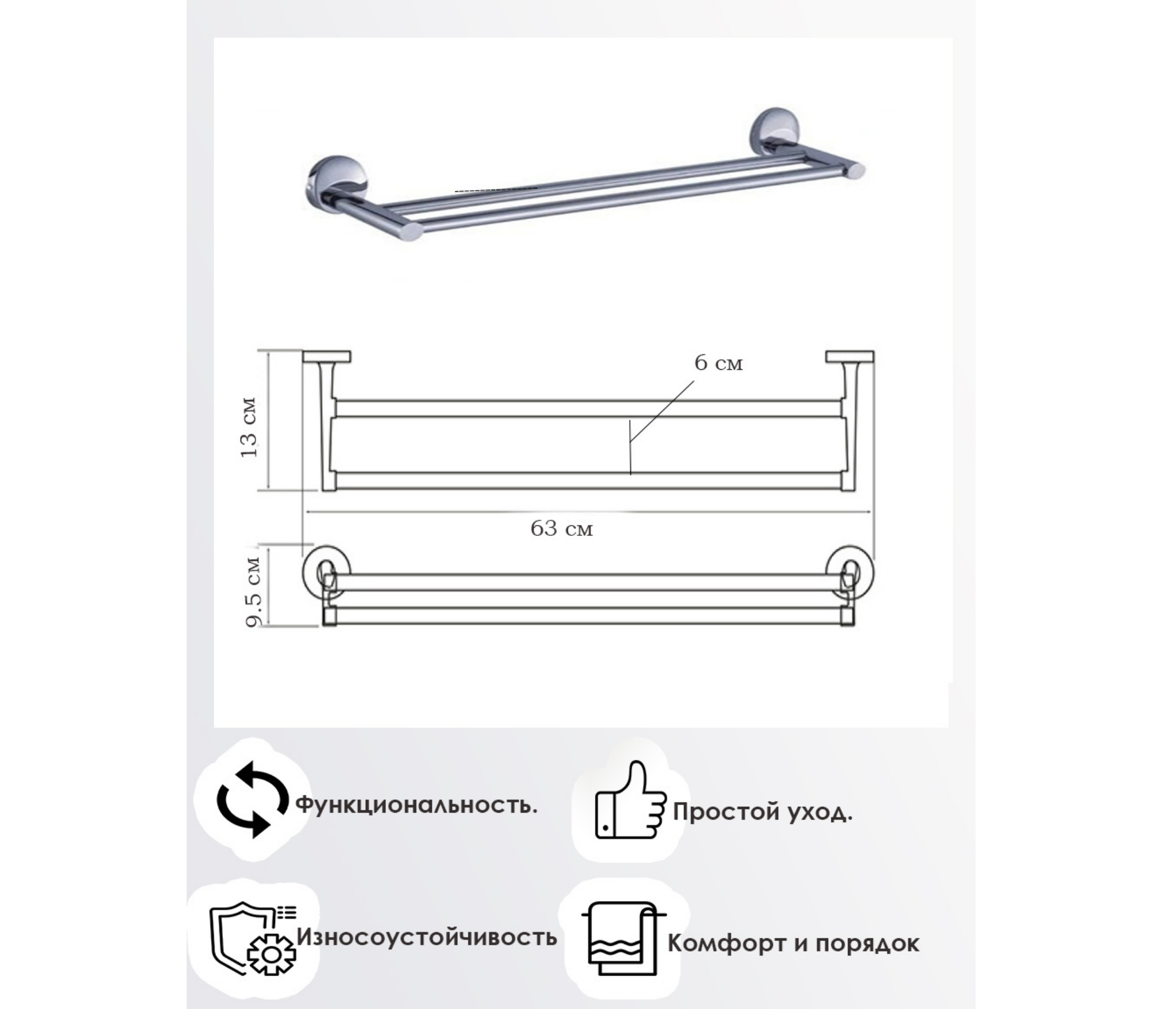 Изделие монтируется к стене при помощи надежного крепежа. Держатель не поддается коррозии, не деформируется и не отрывается от поверхности. Использованное влажное полотенце можно повесить обратно на держатель и аккуратно распрямить для высыхания и дальнейшего использования. Современный эргономичный дизайн держателя отлично сочетается с любыми аксессуарами в ванной комнате.