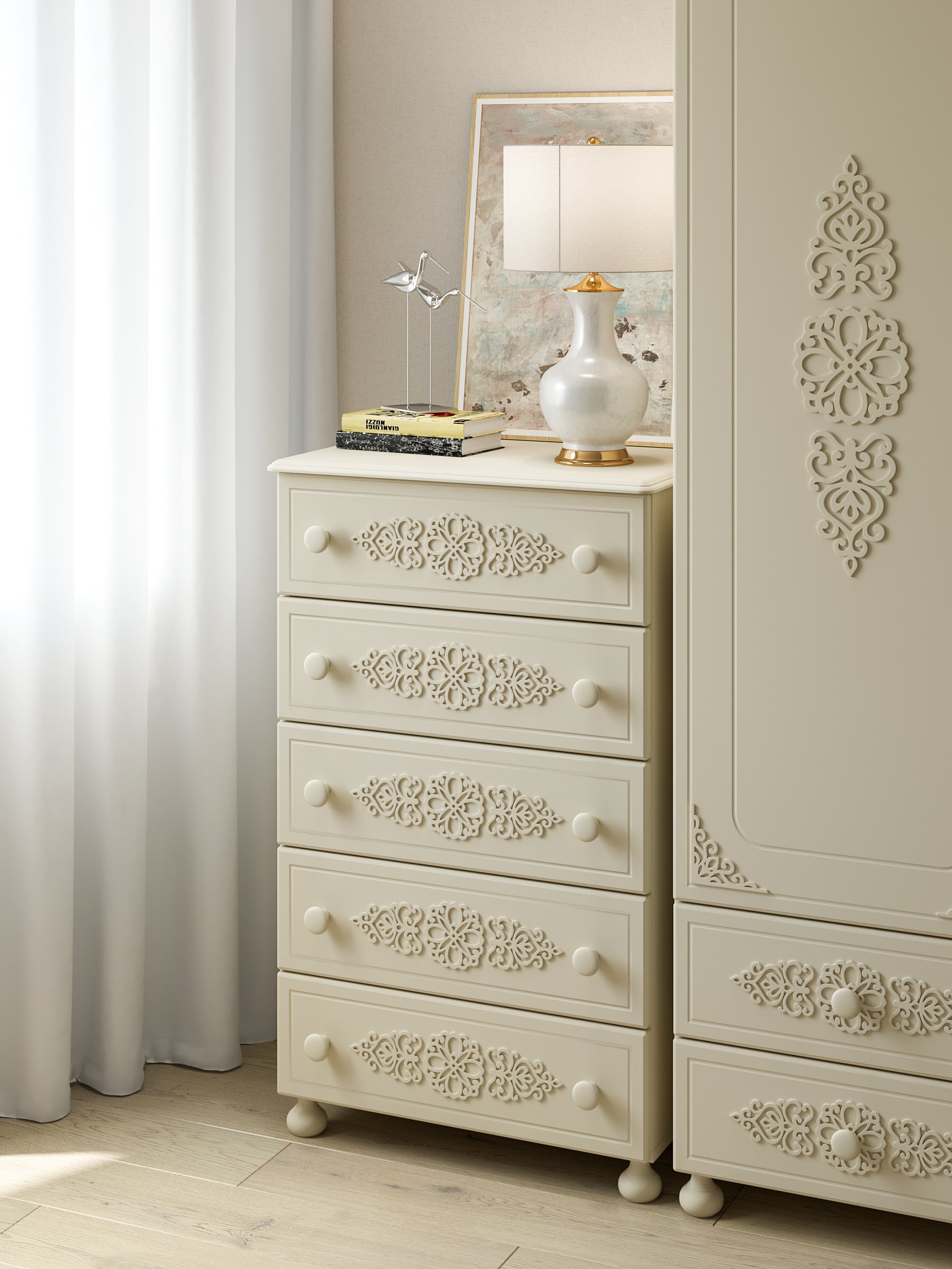 Роскошный комод из коллекции мебели Ассоль АС-62, несомненно, станет украшением Вашей гостиной или спальни. Выдвижные ящики оснащены современными телескопическими направляющими, обеспечивающие плавное и бесшумное выдвижение просторных ящиков. Распашные дверцы имеют качественные петли с плавными доводчиками закрывания. Фурнитура: петли с доводчиками, телескопические направляющие полного выдвижения. Высота опоры 65 мм. Мебель изготовлена из качественной ламинированной ДСП 16 мм. В оформлении фасадов МДФ применяется уникальная технология нанесения объемного узора 3D.