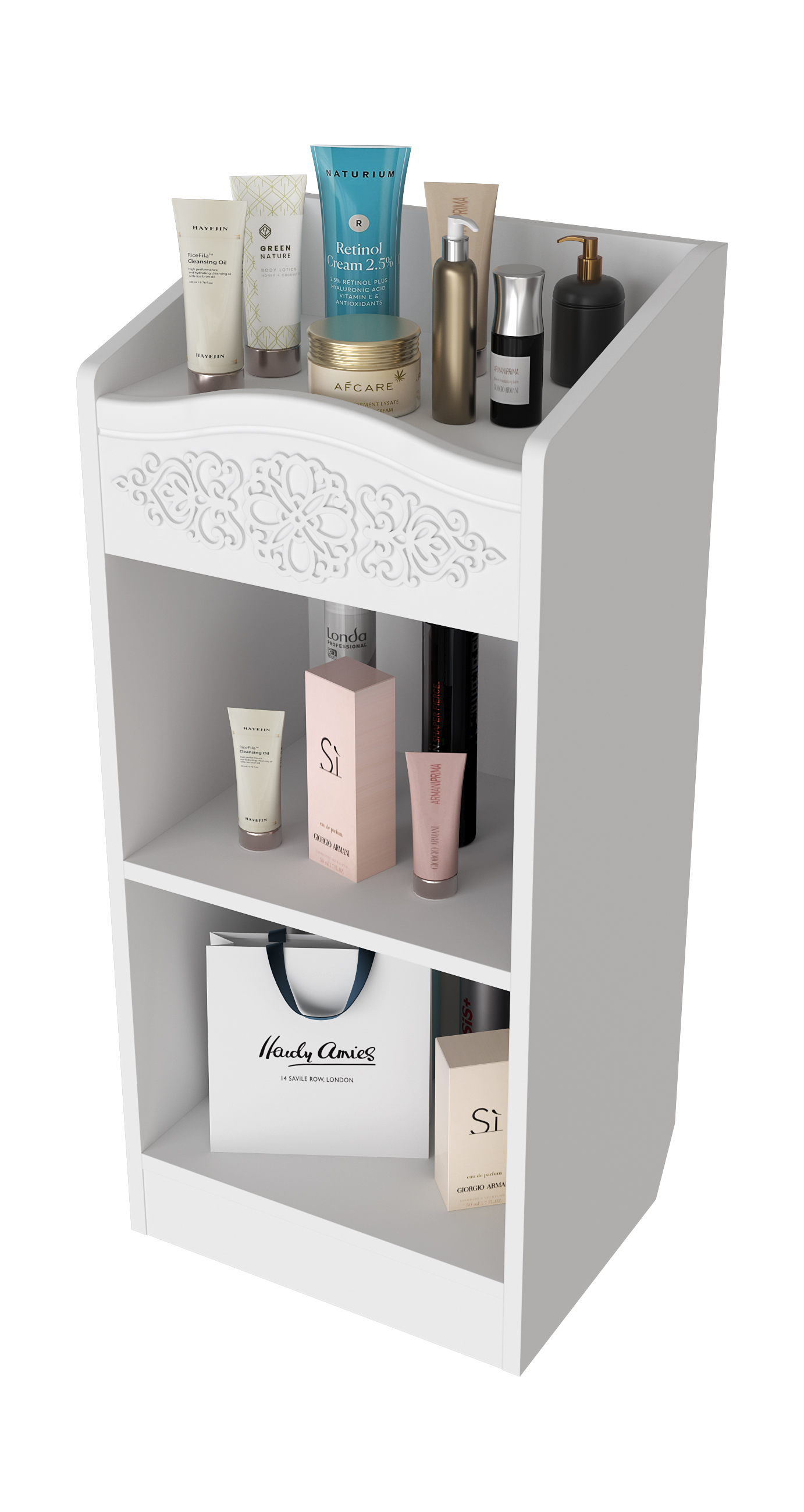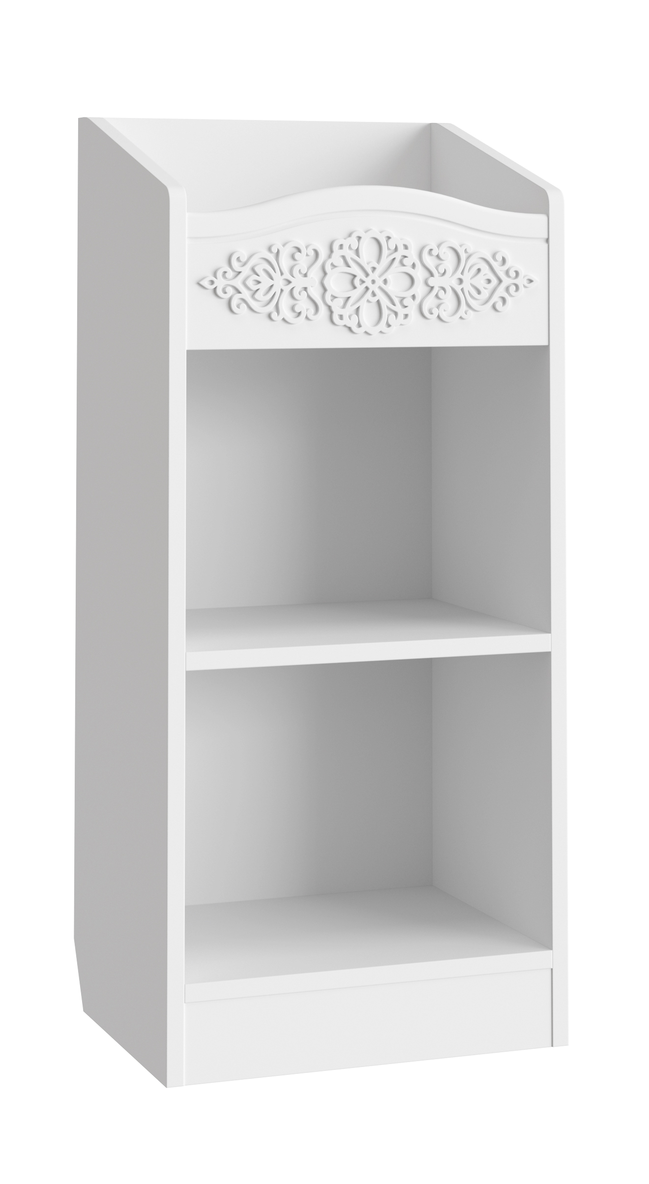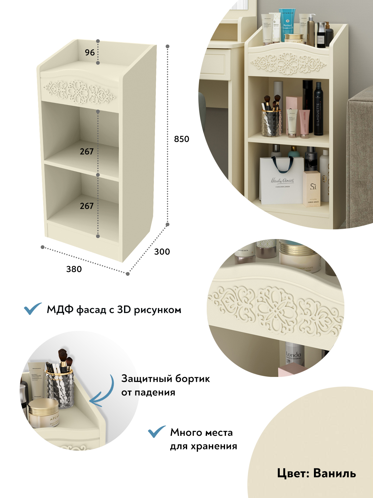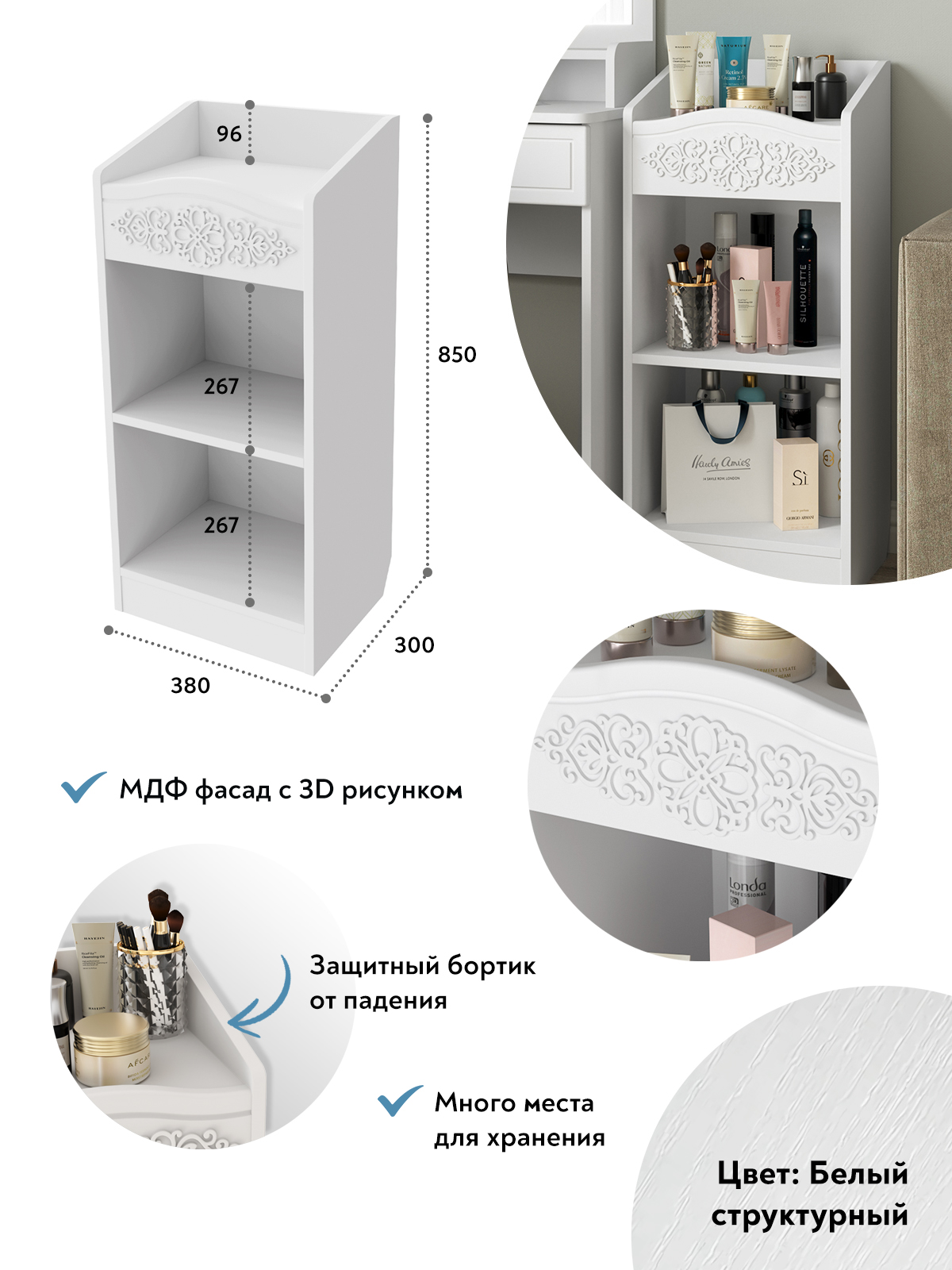 Шкаф АС-66 прекрасно дополнит ваш туалетный столик, создав дополнительное место для хранения книг, парфюмерии и разных аксессуаров. Мебель изготовлена из качественной ламинированной ДСП 16 мм. В оформлении фасадов МДФ применяется уникальная технология нанесения объемного узора 3D.